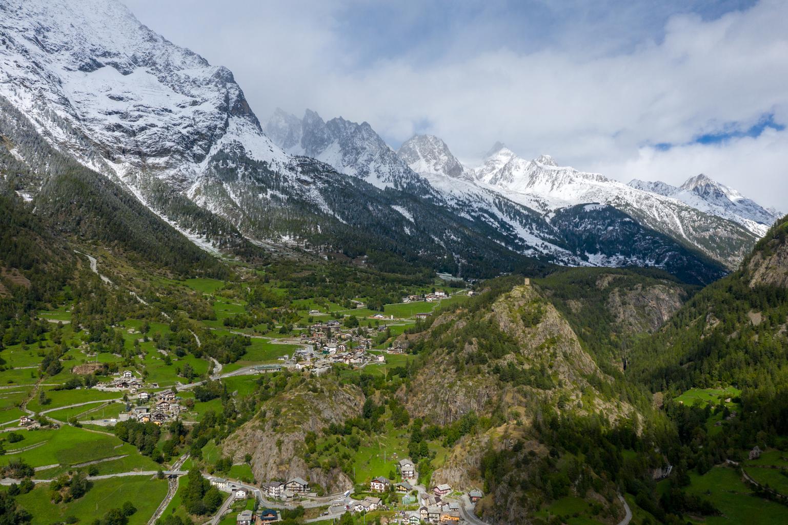 El Valle de Aosta se extiende en el extremo noroeste de Italia, encajado entre algunas de las montañas más altas de Europa occidental, como el Mont Blanc, el Cervino y el Monte Rosa. Este valle longitudinal, recorrido por el río Dora Baltea, ha sido durante siglos un eje de comunicación entre Italia, Francia y Suiza, combinando paisaje alpino y patrimonio histórico.